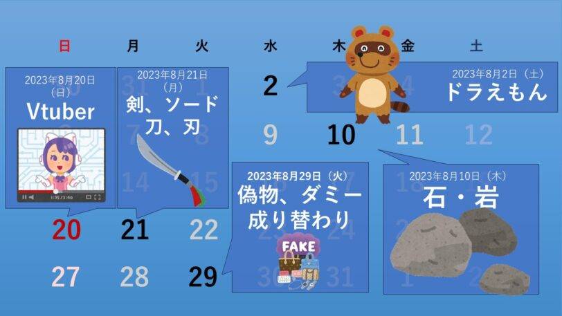 2023年8月29日(火)は『偽物、ダミー、成り替わり』に関するクイズになります。こちらは私がテーマを出して民さんから承認をもらって行ったクイズですが、こういうのがモチーフになってたりそういう登場人物とかすごい気になるのでいろいろな世界の偽物を知りたいと思います。