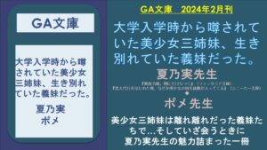 今日紹介する夏乃実先生の『やり込んでいたゲーム世界の悪役モブに転生しました ~ゲーム知識使って気ままに生きてたら、何故かありとあらゆる所で名が知れ渡っていた~』ですけど、そもそも以前も紹介した『大学入学時から噂されていた美少女三姉妹、生き別れていた義妹だった。』の続刊も出ているので、先月は本当に夏乃実先生天国でした。