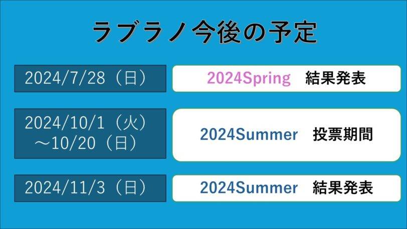 今回は皆様、『ラブラノ2024Spring』にご投票いただきありがとうございました。皆様のおかげで楽しい企画を行えています。まだまだ大きな定番企画に育てていければと思うので何卒よろしくおねがいします。