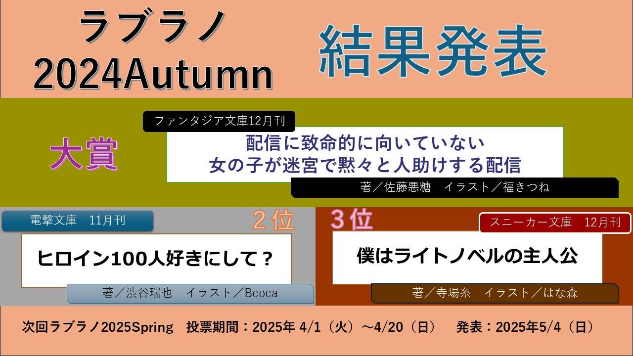 まだまだ、こんなに小さなファンメイド企画ですが大きな祭りにしていきたいと思いますしいろんなライトノベルを知りたいと思うので、皆様も次回以降もよろしくお願いいたします、次回は2025年1月から3月まで発売された本という範囲で投票期間2025年4月1日(火)~4月20日(日)で予定しています。よろしくお願いいたします。
