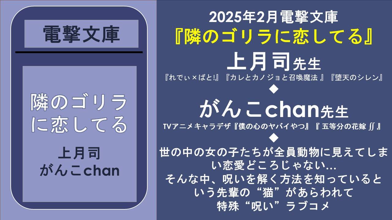 “異性が動物に見える”という呪いを受けている俺だが、もしかしたら隣の席の“ゴリラ”に恋をしているかもしれない。筋骨隆々、ごわごわした体毛、彫りが深く逞しいお顔――恋をする相手としては文字通り人間離れしすぎているが、声としぐさ、会話による反応は完全にクールな女の子だ。そんなゴリラさんと日々仲良く(?)絡んでいると、やはり惹かれていることを自覚してきて……でも一番大事な解呪方法が一向に見つからない!