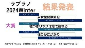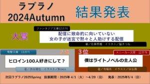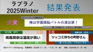 最ラブラノベを100点、注目ラノベを90点、残りの作品を80点と計算させていただき上位の作品をラブラノ2025Spring大賞として表彰させてもらいます。