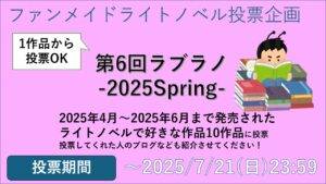 書籍版が2025年4月刊、2025年5月刊、2025年6月刊と各出版社さんが書いているライトノベルが対象です。(もし、明示的に刊行月が示されていない場合は発売日が2025/4/1-2025/6/30になっているものを対象にします。)(電子書籍限定の場合は電子書籍版を基準とします)