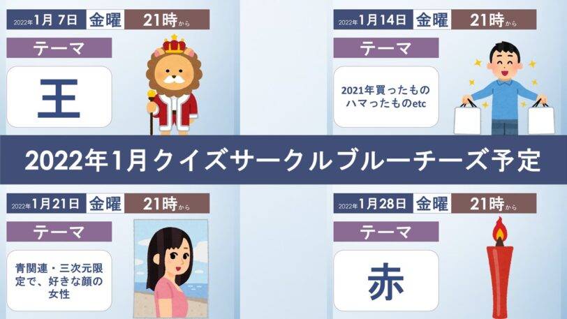 青クイズ(アニメ・ゲーム系クイズ)サークル(#ブルチ) 2022年7月のオンライン開催予定をまとめました、毎週企画を開催しているので是非ご参加ください。 現在、今年度は3つほど企画を開催してみたいと思っていますが下記の企画に興味がある人は是非連絡... -