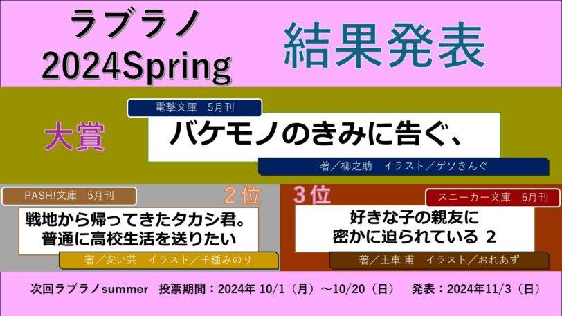 【ファンメイド投票企画】ラブラノ2024Spring 結果発表 大賞は『バケモノのきみに告ぐ、』! 2位は『戦地から帰ってきたタカシ君。普通に高校生活を送りたい』、3位は『好きな子の親友に密かに迫られている 2』と続く