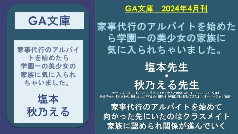 【#ライトノベル感想】塩本先生『家事代行のアルバイトを始めたら学園一の美少女の家族に気に入られちゃいました。』家事代行のバイト先だったのは同じ学園の美少女 家事スキルで彼女の家族に認められ…(GA文庫2024年4月刊)