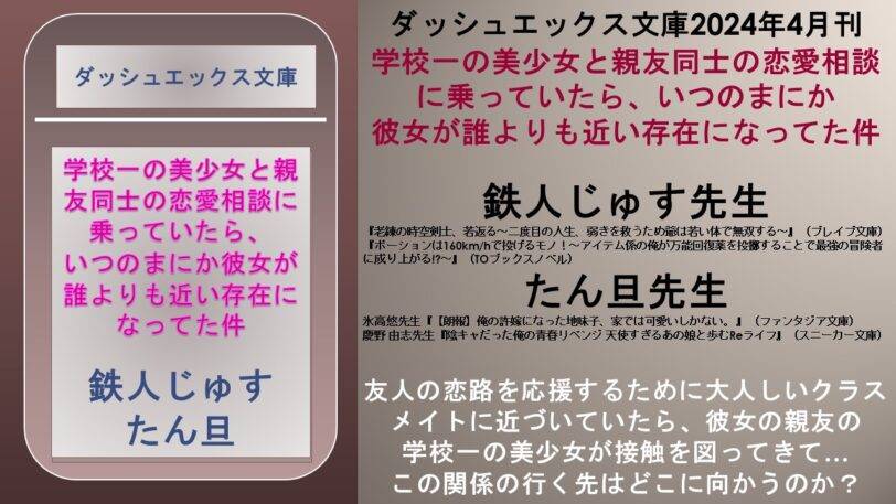 【#ライトノベル感想】鉄人じゅす先生『学校一の美少女と親友同士の恋愛相談に乗っていたら、いつのまにか彼女が誰よりも近い存在になってた件』親友のために動いていたら学校一の美女が急接近⁈(ダッシュエックス文庫2024年4月刊)