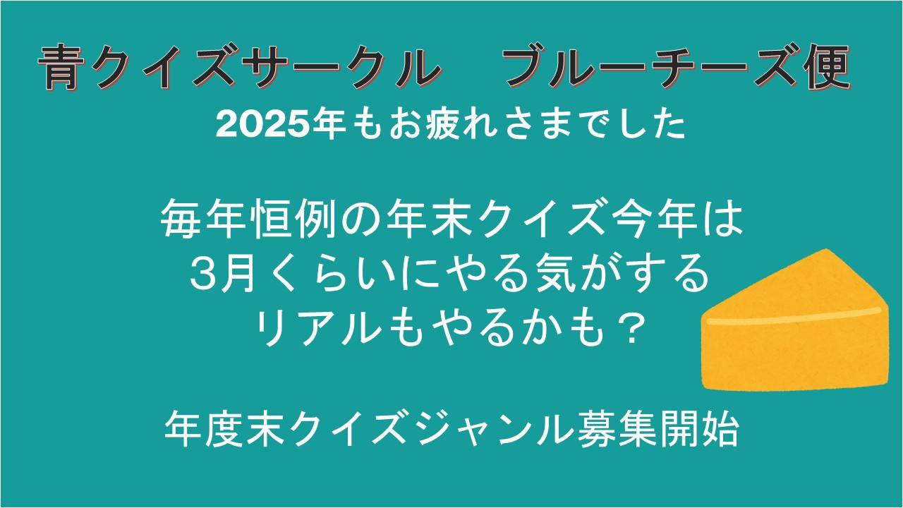 2025年もクイズサークルブルーチーズのクイズみなさま出題や参加ありがとうございました。ほぼ毎週クイズをさせていただき約50ジャンルの出題をさせていただきました。7年目に入るクイズサークル『ブルーチーズ』気楽に入れますので皆さんもアニメゲームクイズに興味がある人は是非入会してください。